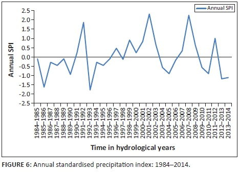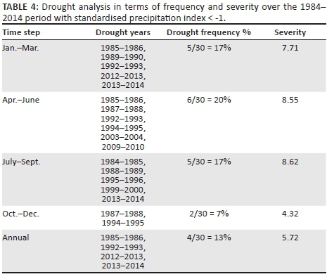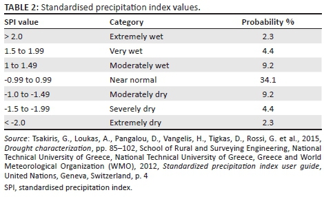 Standardised precipitation index (SPI) is simply defined as a normalised index that represents a probability of a rainfall occurrence of an observed rainfall amount compared to the rainfall climatology at a certain geographical location over a long-term reference period (Man-Chi 2013). Moreover, National Center for Atmospheric Research (NCAR 2015) asserts that SPI is a probability index that provides a better representation of both abnormal wetness and dryness than any Palmer indices such as Palmer Drought Severity Index (PDSI). The merit of this index is that it can be computed for various time scales, hence providing early warning of drought and its severity (Jha 2010). This index is well suited for risk management purposes (Hayes 2006). Another advantage of this index is that precipitation is the only input parameter in its computation making it less complex. However, the weakness of this index is that it can only quantify the precipitation deficit, values based on preliminary data may change, and values change as the period of record grows (Belayneh & Adamowski 2012:2; WMO 2012:4). Table 2 shows values of SPI.