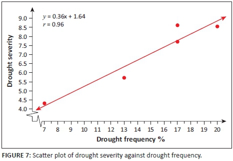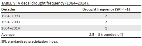 A further analysis was made over decades to characterise drought in Mafeteng district. Table 5 depicts hazard analysis in three decades, which reveal that drought episodes in the study area return every 3 years approximately. Figure 7 shows how drought severity trends with frequency.