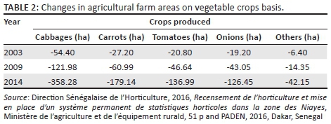 A comparison between the mean agricultural surface areas per vegetable crop and the dynamics of these areas shows a decrease in the agricultural areas of 126.45 ha for onion and 358.28 ha for cabbages in 2014 (Table 2). The volume of production estimated from an average yield (Table 3) also shows a decrease in production of about 18 900 tons for cabbages, 6292 tons for carrots, 3630 tons for tomatoes and 2566 tons for onion. Such a decrease in the volume of vegetable crops has involved considerable loss of income for the local populations. The purchase price at the farmer's level varies from 175 Franc -French Community of Africa (FCFA) per kilogram (kg) of onion to 375 FCFA per kg for carrot (Table 4). Surveys conducted with farmers revealed that nearly 90% of the production is sold in the local and national markets and the remaining 10% was intended for self-consumption. Losses of income resulting from the sale of cabbages, carrot, tomato and onion were about $10 176 380, $3 630 000, $1 421 170 and $977 300, respectively (Table 4). With such loss of income resulting from transforming agricultural areas with the profit of habitat, and industrial establishment, local populations become more and more exposed to poverty. Food insecurity risk also becomes real, given the fact that vegetable crop production was primarily intended to satisfy the external demand.