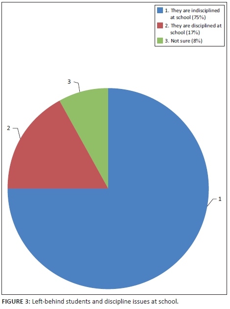 Results indicated (Figure 3) that the majority of the teacher informants (75%) believed that students whose parents migrated often misbehaved at school and are often in trouble with school authorities for various school offences. These children tend to lack close parental control and supervision at home and go on to exhibit such behavioural tendencies at school. Other research findings in this study show that the majority of these children stay with their grandparents who could no longer effectively control and supervise them because of old age. One of the teacher informants had this to say about left-behind students, 'Children whose parents migrated tend to behave badly at school. They are the most rowdy, stubborn and unwilling to learn and very disrespectful'. According to teachers, other cases included absenteeism, bullying, stealing from other students and fighting with others. These results show that international parental migration tend to have undesirable effects on left-behind children in Ward 8, Gweru Rural district. It was reported by the interviewees that there was a perception that most of the left-behind children were smoking and abusing drugs and alcohol.