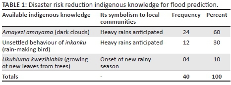 An analysis of the available indigenous knowledge systems of disaster risk reduction in Tsholotsho district (Table 1) shows that many people are familiar with dark clouds (60%), the rain-making bird (30%) and the growing of new leaves on trees (10%) to determine if the rains might result in flooding. This is so because the communities have been relying on these interventions to take appropriate action after forecasting flooding events.