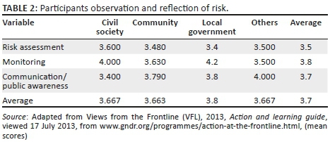 These correspond very well with the concept of observation and reflection as framed within the thinking of Freire (1996) on action and reflection as a means of empowerment. When affected communities are able to observe and reflect on past events, it is taken as a starting point in assessing the risks. When risk is properly assessed, it enables the community to determine what action can be taken to address them. In a way, the aspect of observation and reflection complements the concept of Vulnerability and Capacity Assessments (VCA) at community level (Van Aalst, Cannon & Burton 2008). Vulnerability and Capacity Assessment uses various participatory tools to gauge people's exposure and capacity to resist natural hazards. Vulnerability and Capacity Assessment is carried out at the level of villages and urban neighbourhoods, and uses community member's participation to diagnose vulnerabilities, assess a community's risk priorities and work together with the people to devise ways of increasing their capacities to resist the impact of hazards (Van Aalst et al. 2008). A very good example was stated by one of the participants: