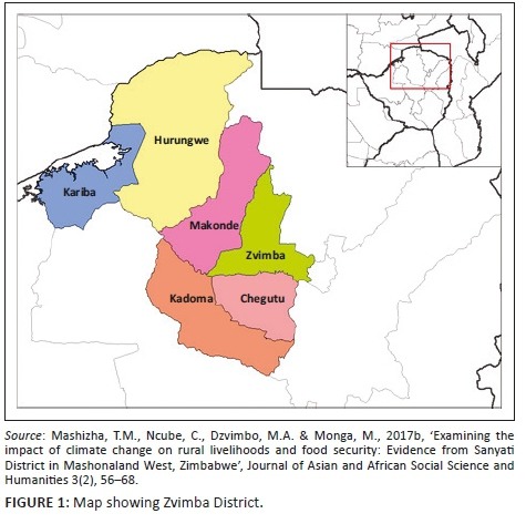 The study was carried out in Zvimba, a district located in Mashonaland West Province of Zimbabwe. The subsistence economy of Zvimba District is based on conservation farming and favourable crops grown in the area including maize, finger millet, ground nuts, vegetables and sorghum (Zimvac 2017). According to Zimstat (2012), Zvimba District has an estimated population of 67 591 based on the 2012 national census. The district is boarded by six other districts and its main town is Murombezi. The coordinates of the district are: 17° 42' 0.00"S, 30° 12' 0.00"E.