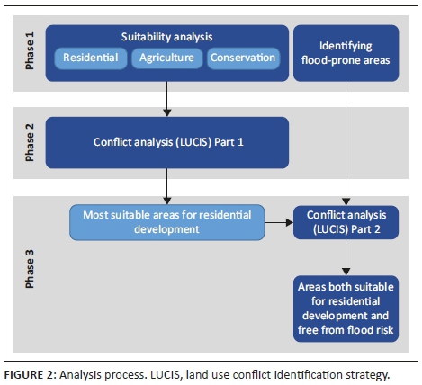 The methodology involved three phases as illustrated in Figure 2. The first phase entailed a suitability analysis to determine the most suitable areas for residential development, agricultural cultivation and biodiversity conservation. The selected land uses were adopted from the LUCIS approach, although the 'urban' class was refined to focus on residential development only, as the main concern was people residing in flood risk areas. It should be noted, however, that land uses can be adjusted to fit the context of a study area and are not limited to the three used in this study. Parallel to the three land uses, flood-prone areas were also identified. Phase 2 involved the application of the LUCIS approach through which areas most suitable for residential development were identified. In the final phase, the identified residential areas were analysed against the identified flood-prone areas to identify the areas that are most suitable for residential development and free from flood risk. The methodological approach will now be discussed in detail.