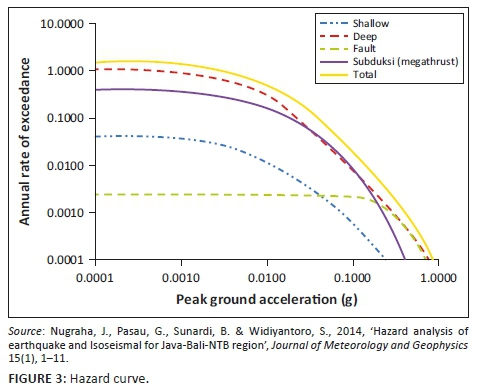 Hazard assessment is first established by hazard curve estimated by plotting annual rate of exceedance versus ground motion. It represents a correlation of occurrence probability of an incident in an area for a period of time. Hazard curve represents seismic hazard resulting from a combination of the ground motion relation and seismic hazard from fault sources: characteristic, Gutenberg Richter and seismic (Somerville 2000).