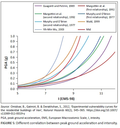 Vulnerability curves define the physical vulnerability as a function of the process intensity and the level of loss, reflecting some structural characteristics of the affected buildings (Papathoma-Köhle 2016; Sengara et al. 2010). Figure 5 shows some correlations between PGA and intensity (I) in European Macroseismic Scale (EMS-98) based on different sources. Table 3 shows damage index table derived from vulnerability curve for residential building typologies in Padang, Indonesia, which typically has the same building typology as Bantul regency. As depicted in Figure 5, the red line which is the mid curve has been applied to interpolate the value of intensity based on the value of PGA which derived from hazard curves of Yogyakarta. Then, the value of damage ratio for those building types which exist in Bantul regency is derived from vulnerability curve for each intensity. Damage ratio of buildings is the ratio between the repair cost of the building to construction cost. By an average of total cost of each building types and properties inside the building which were the results of questionnaire survey in Bantul regency, we then estimated the economic loss. For casualty's estimation, we use a model developed by Coburn and Spence (2002).