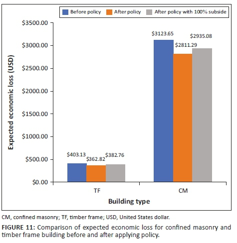 The area under risk curve which stands for expected loss in 50 years has been calculated and compared for both typologies before and after applying policy, as shown in Figure 10 and Figure 11. Based on the calculation result, the reduction number of expected economic losses of CM and TF buildings after applying policy are $312.37m and $40.31m, respectively. Surprisingly, these amounts are higher than the amount which is consumed as policy cost, indicating that the hypothetical mitigation policy is effective for economic loss reduction in both typologies.