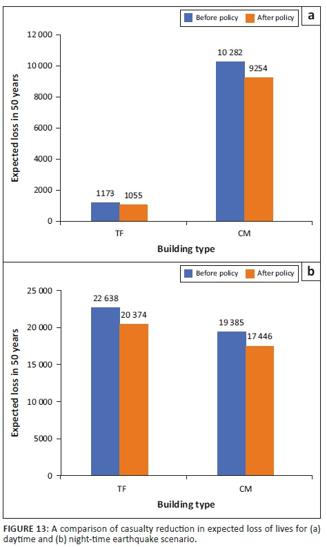 Figure 12 depicts the number of casualties for CM and TF buildings before and after reconstructing 10% of the building with RISHA. Figure 13 shows the comparison of expected number of casualties which indicate that by applying policy for both CM and TF buildings, the expected numbers of casualties are deceased. This reduction numbers are 1028 and 117 people in daytime earthquake scenario and 1938 and 2264 people in night-time earthquake scenario for CM and TF buildings, respectively. This result indicates that this hypothetical mitigation policy is not only effective to reduce the economic losses but also affective to reduce the number of casualties.