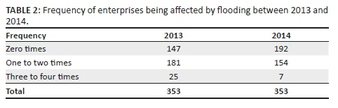These findings correlate with the answers given by the interviewees about the year in which they experienced the most severe flood impact (Table 3). A total of 53.5% (189 SMEs) of the sampled enterprises experienced the severest flood in 2013. Among all the businesses surveyed, only 69 did not experience any flood damage in the years 2013 and 2014.