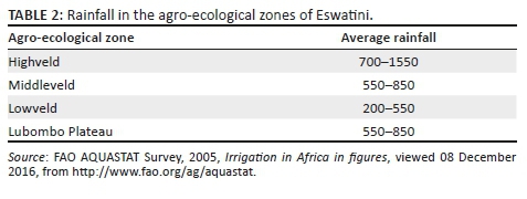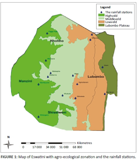 Eswatini is a landlocked nation almost entirely contained within the northeast corner of South Africa and located at the transition of the South African Plateau (reaching over 1500 m) to the Mozambican coastal plain. The country has a total area of 17 364 km2 and has approximately 12 220 km2 of agricultural land, or 71% of the total land area (FAO 2013). The country has four administrative districts (Hhohho, Manzini, Lubombo and Shiselweni) and is classified into four agro-ecological zones (AEZ), taking into account elevation, landforms, geology, soils, climate and vegetation: Highveld, Middleveld, Lowveld and Lubombo range.