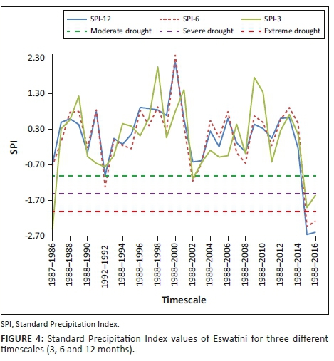 Differences were observed in the SPI results across different timescales. Moderate droughts were the most frequent within 3-, 6-, and 9-month categories, with the Middleveld having the highest occurrences. In 1992, for example, the 6-month and 12-month SPI indicated moderate drought, whereas the 3-month SPI showed no drought conditions. In 2006, the 3-month SPI indicated severe drought conditions, whereas the 6- and 12-month SPI indicated mild- to normal-drought periods. The 3-month SPI may be misleading, especially in areas where it is normally dry during that 3-month period. The differences in drought conditions may therefore be related, with the response of the short-term soil moisture conditions to precipitation during that short timescale for both 3-month and 12-month SPI (Saada & Abu-Romman 2017; WMO 2012). In 2006, it is evident that a drought event (as indicated by the 3-month SPI) occurred in the middle of a longer term drought, as evidenced by the 12-month timescale result. Therefore, it is important to compare the 3-month SPI with longer timescales (NDMC 2006; Rouault & Richard 2003).