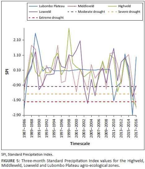 Comparing the 3-month SPI across AEZs, most drought events were experienced in the Middleveld and Lowveld zones. Extreme droughts were experienced in all AEZs in 1986 and 2016. When the 3-month SPI was calculated for the different AEZs, there were parallels with the drought periods that were declared and documented in the EM-DAT database (EM-DAT 2016). This means that within the country there are spatial differences for drought severity and intensity. For moderate drought, however, the SPI calculation typifies the droughts, which were also declared in most of the AEZs. Therefore, the SPI can be used to typify drought by AEZ, with the Lowveld being the region that is most prone to drought.