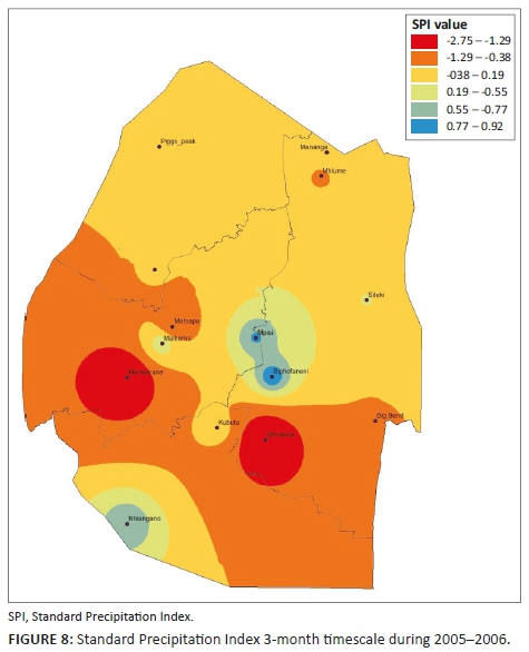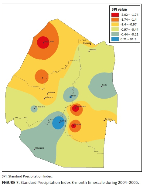 The Eswatini rainfall data set of 2006-2017 was uploaded onto the DrinC software for manipulation. The SPI was calculated at 3-, 6- and 12-month timescales. The primary reference base in DrinC is the hydrological year (October to September); however, the study defined the hydrological year based on the Eswatini rainfall calendar. For the 3-month SPI, the hydrological year covered October, November and December. Ji and Peters (2003) found that the 3-month SPI is the most effective for monitoring drought impact on vegetation, especially when the 3-month period coincided with the peak growing season. The 6-month SPI hydrological year covered July to December, whereas the 12-month SPI hydrological year covered January to December. The 3-month SPI indicates the conditions of short-term drought, mostly soil moisture and drought stress with an impact on agriculture, while the 6- and 12-month SPIs indicate medium- to long-term droughts which affect ground water supplies and pasture conditions. The study therefore mapped drought severity at 3-, 6- and 12-month timescales in the four agro-ecological regions of Eswatini. The month of December was chosen for calculating the SPI for 3-, 6- and 12-month timescale as October is when the rainfall or agricultural season starts, whereas December is mid-season where the main cereal crops (maize) will be flowering. The 3-month period of October to December is therefore normally the critical wet season and therefore the onset of drought in this period will affect crop production.