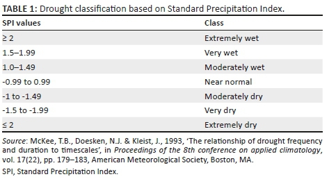 Over the years, many drought indices were developed and used by meteorologists and climatologists around the world. The most commonly used index worldwide though is the SPI. McKee developed the SPI during the early 1990s (McKee, Doesken & Kleist 1993). The World Meteorological Organization (WMO) in 2009 recommended the SPI as the main meteorological drought index that countries should use to monitor and follow drought conditions (Hayes et al. 2011). Currently, many scientists prefer the SPI as an index for drought risk (Giddings et al. 2005; Gutman 1999; Hayes et al. 1999; Jordaan 2011). The index is recommended because it allows the comparison between different climates and locations. It can be used to analyse drought or anomalously wet periods at a particular timescale for any location in the world with daily precipitation records (McKee 1995; Moreira et al. 2008). Using the SPI as an indicator for drought monitoring, early warning drought disaster declaration will limit the arbitrary decision-making of politicians with scientifically based criteria.