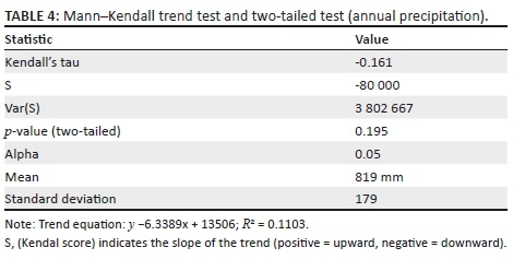 Trend analysis was also performed on an annual scale to examine whether any trends existed in the data. The annual rainfall time series, averaged over the whole data set, is illustrated in Figure 3 with the corresponding Sen's slope plotted. The variability around the mean (819 mm) was evident and pronounced, indicating a decrease over time in annual rainfall. The standard deviation of the annual rainfall shows higher values than the average, indicating the deviation from normal is considerable. Further, Mann-Kendal test results (Table 4) indicate a decreasing trend in annual rainfall across all meteorological stations. The Sen's slope estimate of rate of decrease is −80 mm per year. However, the decreasing rate is not statistically significant at α = 0.05. The rainfall trends demonstrated a variation in the spatial variations of the Highveld, Middleveld and the Lubombo Plateau agro-ecological regions. The Lubombo Plateau had the highest mean rainfall, whereas the Lowveld had the lowest mean rainfall over the study period.