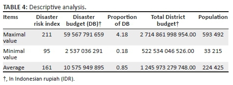 To our knowledge, research on disaster budgeting is still scant (Oktari et al. 2017). Most of the previous research deals with the calculation of financial loss caused by disasters and government spending for disasters (see, e.g. Benali, Abdelkafi & Feki 2018; Toya & Skidmore 2007). Indeed, previous studies such as by Kusumasari, Alam and Siddiqui (2010) have been conducted mostly in developed countries rather than in developing countries. Hence, the present study analyses the association between the DB, index of disaster risks and the population of 23 districts in the Aceh province, northern Indonesia, between 2014 and 2016. Aceh is selected as the site of study because this region was partly destroyed during the 2004 tsunami and other disasters, that is, earthquakes and floods. The present study assumes that the vulnerability of the region to natural disasters has been (or should have been) taken into account in allocating budget for disasters. The DB is represented by how much money is provided annually for Badan Penanggulangan Bencana Daerah (BPBD or local DM agency) as the government department responsible for the DM. In addition, this study is conducted at the local government level because they know more about their citizens and situation compared to other actors, that is, central government (Kusumasari et al. 2010; Putra & Matsuyuki 2019).