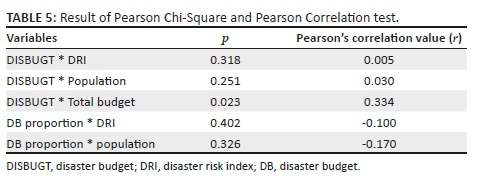 Furthermore, by employing Pearson's chi-square test and the Pearson correlation test (Table 5), the DRI indicates a negligible correlation to DB (DISBUGT) (r = 0.005, p = 0.318). Similarly, the correlation between the DB and population showed an insignificant correlation (r = 0.030, p = 0.251). The same result is also found for the relationship between the DB proportion and DRI (r = −0.100, p = 0.402) and between the DB proportion and population (r = −0.170, p = 0.326). The only correlation that was confirmed is between DISBUGT and the total budget (r = 0.334, p = 0.023). Thus, the present study indicates that DB has a positive significant correlation with the total budget of the studied local governments. This can be interpreted as a larger DB being found in the local government with a bigger budget. In this case, local governments with a higher budget have a higher budget for disaster.