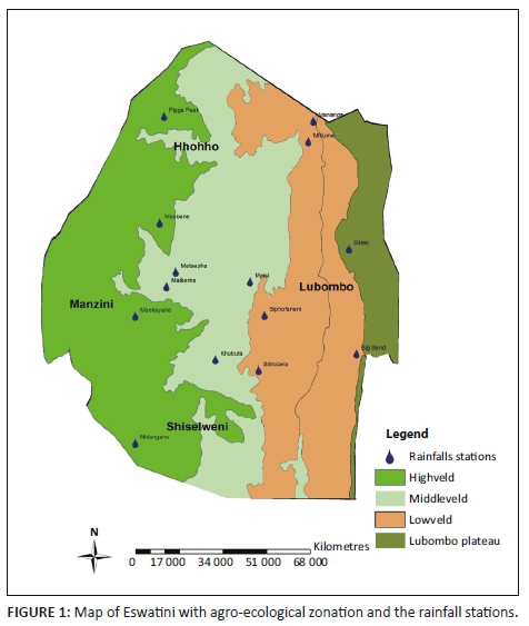 The country is classified into four agro-ecological zones (AEZ) - Highveld, Middleveld, Lowveld and Lubombo Range - based on elevation, landforms, geology, soils, climate and vegetation. The rainy season is from mid-October to mid-April, with mean annual rainfall ranging from 700 mm to 1500 mm in Highveld to 200 mm in the southern Lowveld (Table 1). These large ranges indicate the fluctuating nature of Eswatini's climate and make the country very vulnerable to meteorological hazards such as drought and floods (Figure 1).