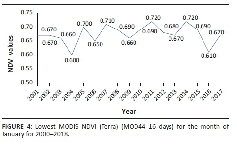 The MODIS NDVI average values for Eswatini indicate that for the months of January-May the NDVI values are high, indicating the growing season. The peak vegetative period is from February to April (GOS 2016), where the NDVI values fall between 0.65 and 0.75 (Figure 3), which correspond to dense vegetation. Analysing the month under study, January, it is observed that low-NDVI values correspond to the drought years (Figure 4) that have been indicated for Eswatini.