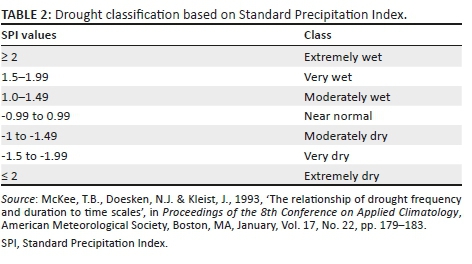 The SPI was used for drought monitoring for the time series from the period 1986 to 2017. Representative meteorological stations of the Eswatini Meteorological Service were selected, with good data. The stations covered all agro-ecological zones and administrative regions in Eswatini. Only stations with full data were considered for analysis. There was therefore no data filling or corrective homogeneity enforced. The SPI computation was achieved through the use of DrinC software, and drought classification (Table 2) was based on the SPI classification (McKee et al. 1993) where a drought event occurs any time. The SPI is continuously negative and reaches an intensity of −1.0 or less (McKee et al. 1993, 1995).