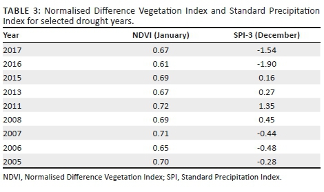 The analysis of remote sensing-based drought indices and SPI can provide a far-reaching understanding of the spatio-temporal dynamics of large-scale drought patterns. Because of the strong positive correlation between NDVI and SPI, the two indices can be used to monitor and detect drought, thereby providing early warning information to stakeholders. To quantify the strength and duration of droughts that could have a significant impact on the population and the economy, the study derived statistical threshold based on parameters from NDVI, time series of SPI-3. Normalised Difference Vegetation Index and 3-month (October-December) SPI, and precipitation data from 2001 and 2017 were used to develop the statistical threshold to classify drought periods. Normalised Difference Vegetation Index for all the drought periods, for the month of January, averaged 0.66. The 3-month SPI values for the month of December ranged from 1.76 to −1.90.
