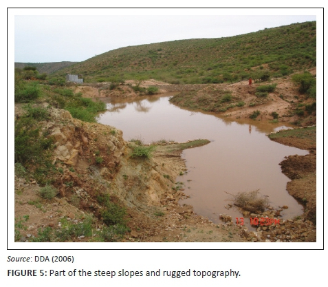 Results from Risk and Disaster Prevention officials confirm that, indeed, floods are prone in Dire Dawa city because of a number of factors which are manmade and natural (DDADPFSO 2014). The latest incident of flooding happened in August 2006 when Dechatu River overflowed its banks whereby an estimate of over 200 people were reported dead, thousands were displaced and there was extensive damage to homes and markets. Floods in Dire Dawa are fairly common during June to September, which is the rainy season. Based on the draft report by Adam et al. (2006:10), the devastating flood that occurred on 06 August 2006 caused the death of about 256 people, displaced 9956 people and 244 people went missing. The flood caused huge damage to urban infrastructure, roads, bridges and houses. Investors, traders, small and petty traders lost property worth Ethiopian Birr 30 054 275 (US$3 756 784.38). Figure 3 illustrates the damage caused by the 2006 floods on existing infrastructure.