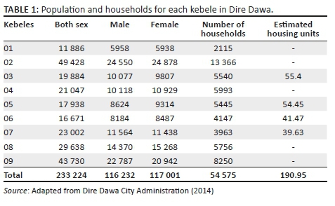 In order to determine the actual sample size, estimated housing units were considered on the following assumptions that Dire Dawa flood-prone kebeles are now sparsely populated, and people have migrated to safer kebeles. The majority of the population living in Dire Dawa are Muslims who marry more than one wife and have an average number of seven children and above and therefore an average of 10 people per household were considered. This aided in determining the housing units for the four kebeles purposively chosen for the study. Using the Kothari (2004) formula, the actual sample size for the study was 128 as follows: n = z2pq/d2, n = (1.96)2 (0.25)/0.025 = 384., Fn = n/(1+n/N), fn = 384/(1+384/190.95) = fn = 128 (where n is the desired sample size, z is the standard normal variable at a required level of confidence, p is the proportion in the target population estimated to have characteristics being measured, q = 1-p and d is the level of statistical significance set).