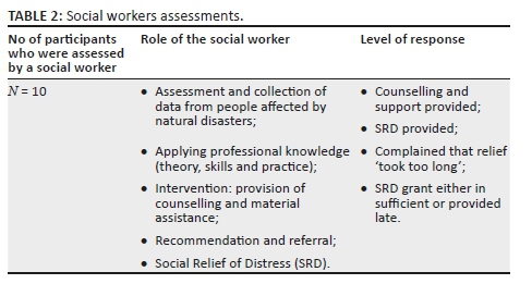 Table 2 presented the findings collected from the participants from the affected households, confirming the fact that social workers did conduct assessments and collect information after their having experienced a natural disaster. However, they indicated that sometimes social workers take long to respond with the required material assistance. Furthermore, they indicated that when the social workers did eventually respond, they would deliver cash vouchers and blankets six months after a disaster had occurred. The following extract from the focus group discussions demonstrates this view: