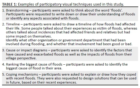 The aim of this study was to understand the perception of communities towards flood hazards and to probe how communities respond to flood hazards and how this knowledge can be used in the planning and management of future disasters. From the beginning, the emphasis has been to encourage participation of those who were affected by floods and engage them in suggesting and acting upon solutions that can be used in future and for policy-making. As we have noted, four participatory approaches have been identified in the literature (Dovie 2003; Pain & Francis 2003). In order to achieve the aim and research questions of this study, PRA method (Chambers 1994, 1997; Dovie 2003; Pain & Francis 2003) was found more suitable. This technique, now also known as PLA (Chambers 2002; Dovie 2003; Pain & Francis 2003), was found appropriate because it concentrates on exploring diversity in communities and allowing communities to design solutions to their own problems (Cronin et al. 2004). In addition, this methodology often involves participatory diagramming with other techniques such as interviewing and observation.