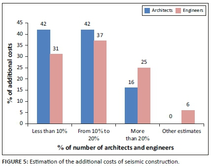Two questions concern the additional costs that seismic construction can induce. The first is whether new seismic construction actually induces additional costs. The second is reserved for those who respond with a statement, to give an estimate in percentage terms of the project cost. The responses are provided in Table 15 and Figure 5.