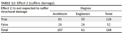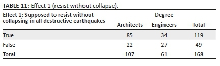 Two questions concern the resistance of buildings to quakes and the occurrence of structural damage for buildings calculated according to seismic codes, which had been implemented correctly. The first item (Effect 1, Table 11) examines if the construction calculated according to seismic codes is supposed to resist without collapsing in all destructive earthquakes. The second item (Effect 2, Table 12) is to see if this same structure is not expected to suffer structural damage. The exact answers to these questions are obviously 'wrong' for both questions, but the answers collected are tabulated below.