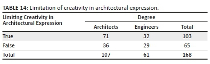 The responses in Table 14 show that 66% of architects and 52% of engineers surveyed believe that seismic codes and design inhibit the artistic expression of forms, structural and material choices.