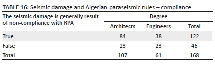 We try to determine the opinion of BET professionals regarding seismic damage to buildings in general, that is, whether or not it is the result of incorrect application of RPAs or partial or total non-compliance with requirements. The answers are presented in Table 16.