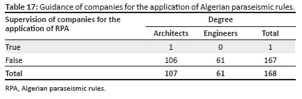 This question (Do you consider that the companies are well supervised for the application of the RPA codes?) aims to obtain the opinion of architects and engineers from the BETs who supervise the worksites and the qualification of technical staff for the application of RPAs. The result is presented in Table 17.