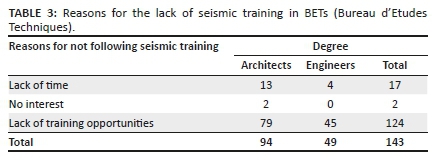 It should be noted that almost all of the architects and engineers interviewed without seismic training (almost 87%) attribute it to the absence of training opportunities in this field.