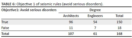 The answers to this question, which are shown in Table 6, show that 10% of respondents think that 'avoiding serious disorders' is not the main objective of seismic rules. The sorting of the answers shows that this rate is 11% amongst engineers, which is equivalent to that of architects (10%). However, this rate should be as low as possible, since engineers use seismic codes more than architects and should therefore know their objectives better. This unexpected result can be explained by a nuance of personal interpretation: the 'false' answer of this group of engineers is correct if it has been specified that the magnitude of the quake is very high.