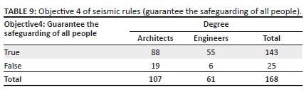As shown in Table 9, the correct answer to this question represents 83% of architects and 90% of engineers. Despite its small proportion, the wrong answer can support the hypothesis about the basic level of knowledge about objectives of seismic regulation.