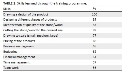 They were asked to indicate their understanding of 'entrepreneurship' and 'entrepreneurial innovation'. A range of responses were provided, which included 'owning a business (95%), starting your own business (67%), producing items for a specific market (64%), producing a unique product (63%) and coming up with a new idea (64%)'. They were asked to indicate what they learned and which task they can confidently do on their own without the assistance of the trainers. Their responses are summarised in Table 2.