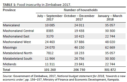 In 2018, the Government of Zimbabwe needed to support about 302 000 households who were food insecure (Government of Zimbabwe 2017). This was even though the government had attained 'the targeted maize production level of around 1.2 million tonnes in the 2016/17 Summer Cropping Season' (Government of Zimbabwe 2017:156). Table 1 shows the disaggregated food insecurity across Zimbabwe's 10 provinces. As illustrated in the table, food-insecure households in Zimbabwe's 10 provinces have increased from 101 260 in July-September 2017 to 301 872 in January-March 2018. Masvingo province is top on the list with an increase of food-insecure households from 24 070 to 62 669, mainly because the area is known to be drought-prone.