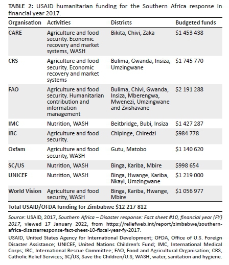 As illustrated in Table 2, NGOs such as CARE, CRS, FAO, United Nations Children's Fund (UNICEF), International Rescue Committee (IRC), Oxford Committee for Famine Relief (OXFAM) and World Vision are working tirelessly to ensure water and food security in Zimbabwe. The activities supported by these organisations are important in fighting water and food insecurity, thus building resilience amongst communities in rural Zimbabwe. A total funding of $12 217 812 was budgeted to enhance resilience amongst rural communities in the face of El Niño conditions. These efforts are not enough to cushion all rural communities from El Niño-induced disasters; nevertheless, they are a step in the right direction.