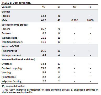 Data were organised, cleaned and analysed using the Statistical Package for Social Sciences (SPSS) V23 where different reckonings were applied to give meaning to the data. These included cross tabulations, Likert ranking scale analysis and variable reductions through principal component analysis. In the determination of social capital gains or benefits of CBPP, 112 principal components were initially defined and these were reduced to five3 components that marked the benefits and/or capital gains. The reduction was informed by the frequency of grouped responses and/or themes, which were further aligned with the gains that evolved in the qualitative response analysis. In an effort to determine the magnitude of women empowerment, gender analysis was computed and was presented as mean ± SD with the level of significance set at p < 0.05 and a t-test was used to test for mean differences. Qualitative data were analysed using NVIVO version 12 and thematic content analysis applied.