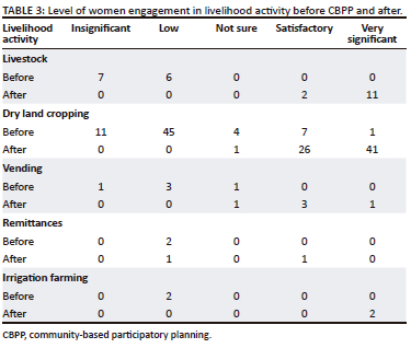 As indicated earlier, CBPP approaches offer grassroots the opportunities to influence the planning processes and local decisions. In this regard, inclusivity becomes a necessity towards gathering relevant data for informed decisions. This makes gender considerations very significant in enhancing inclusive planning. However, despite that equal representation of women and men in planning platforms is meant to allow for the collection of diverse views, in the majority of cases, dominating in numbers does not guarantee influence in decision making. Women have, in the majority of cases, been left out or dominated in local decisions owing to cultural and other local dynamics. The results in Table 1 indicate that 53% of the respondents were female while 47% were male. There was a higher number of women than men because the majority of men are outside the area seeking alternative sources of income and/or expanding their livelihood base (Table 1, Table 2 and Table 3). This was confirmed by one of the ladies who said in 'isindebele obaba awubatholi ekhaya', meaning men rarely reside at home, a sign that they are highly mobile seeking ways to strengthen their ability to absorb shocks.
