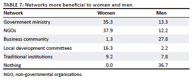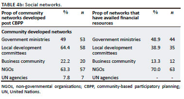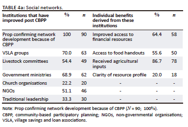 A very significant proportion (95.6%) of the respondents indicated that the CBPP improved the participation of different socio-economic groups in community development. The The results in Table 4 suggest that individual networks improved as more Village Savings and Loan Association (VSLA) groups were established and there were more engagements, that is, 69% with government, 51% with NGOs while 54% with local development structures such as the livestock development committees. Village Savings and Loan Association are self-managed associations which provide members with a secure means to keep their money and access it (Ksoll et al., 2015). Broadly, these are community-based financial establishments for the intent of helping members and outside members access credit. Such loans are usually accessed at low interest rates. The objective is to promote thrift, self-reliance and financial inclusion among rural communities, particularly the marginalised groups. The findings indicate that women are benefiting more from government line ministries and NGOs when compared with men resulting from empowerment models promoted by these networks. Targeting of women by these networks is encouraging. However, more needs to be performed to improve women's influence on decision making at household and community levels as corroborated by one of the respondents that 'women receive most of the support inputs from government and NGO but men have the final say on their use' (Ward 8, traditional leader, male). Men's power is concentrated more on entrepreneurship allowing them to dominate in retail shops and sole trading. The desire to be self-reliant prompted the majority of women to be part of VSLAs to enhance access to financial capital. Other benefits accruing from these individual networks include the flow of resources largely through agricultural inputs and food assistance interventions.