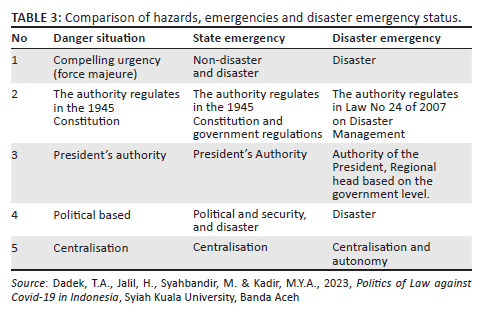 Since coronavirus disease 2019 (COVID-19) emerged in China and was declared a pandemic by the World Health Organization (WHO 2020) on 11 March 2020, 228 countries have been affected, resulting in 5 821 004 deaths and 412 351 279 infections, while in Indonesia 4 966 046 persons were infected and 145 622 died in 365 districts or cities (Covid19.go.id 2021). This situation continues to persist without anyone knowing when it will come to a halt. The Government of Indonesia's primary response to COVID-19 has been to convert the natural hazard into a legal event with a process for evaluating the status of a disaster emergency (The Disaster Management Act, ss. 1-18).