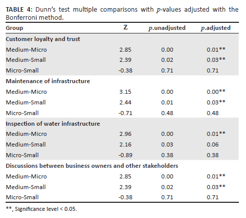 The Cohen's d test was used to assess the practical significance of the differences found between the different business sizes in the Dunn's test. In terms of 'Customer Loyalty and Trust', the large effect size of 7.06 (Table 5) indicated that the medium-sized businesses differ significantly from their smaller counterparts and the difference holds significant practical impacts. In terms of infrastructure-related factors, both 'Maintenance of Infrastructure' and 'Inspection of Water Infrastructure' showed major effect sizes of 3.16 and 3.14, respectively. This indicates that medium-sized businesses, as identified by the Dunn's test, differ in their approaches to maintaining and inspecting infrastructure compared to Micro and Small businesses and have significant practical impacts. Lastly, in terms of 'Discussions between Business Owners and other Stakeholders', the effect size of 3.16 reinforces the Dunn's test findings, indicating that medium-sized businesses significantly differ from their smaller counterparts in engaging with stakeholders in a practically meaningful manner.