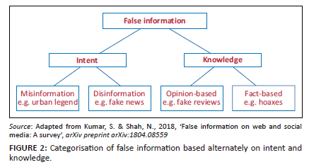 Kumar and Shah (2018) categorise false information into misinformation and disinformation, based on a person's intent with the false information. In addition, Kumar and Shah (2018) posit a second classification of false information based on knowledge, where opinion-based false information does not involve a basic truth and fact-based false information relates to outright lies about subjects that have inherent truth. Consequently, Kumar and Shah (2018) presented the dual categorisation of false information (Figure 2) based on the intent with and knowledge of the information being created or disseminated.
