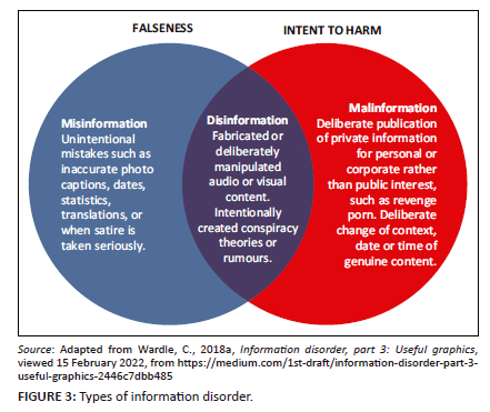 Baines and Elliott (2020) tentatively describe three types of false information, namely, misinformation, disinformation and malinformation. These terms are differentiated based on the intent behind the spreading of the information: misinformation being unintentional, disinformation being deliberately misleading, and malinformation being factually reconstructed. The Aspen Institute (2021) holds similar views on the different types of false information in circulation and cites Dr Claire Wardle as the architect of the relatively new concept of information disorder. Wardle (2018a) approached the difference between misinformation and disinformation from a slightly different angle, asserting that in the case of misinformation, the person propagating the false information believes it to be true, while in the case of disinformation, the person is perfectly aware that the information is false. Malinformation is authentic but used to cause harm to an individual, an organisation or a country. Information disorder, represented by its three components, is illustrated graphically in Figure 3.