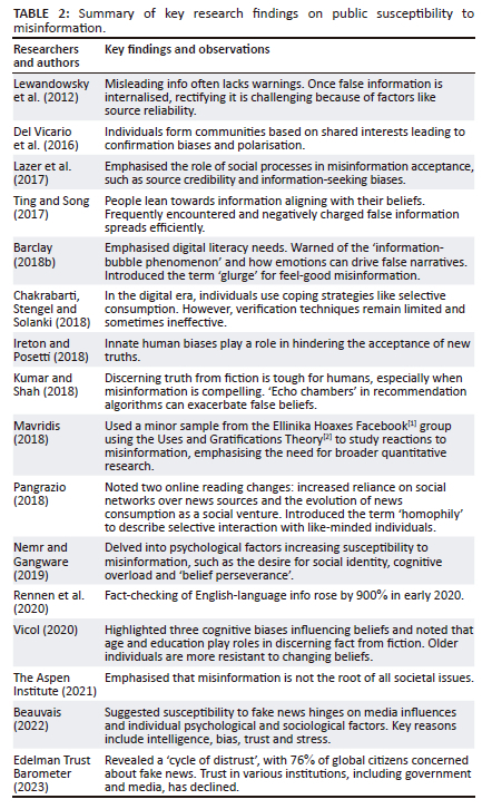 A considerable amount of research has been done in recent times on the susceptibility of people to false information. The review of the literature has therefore allowed several findings to be made in this respect. These findings are shown in Table 3.