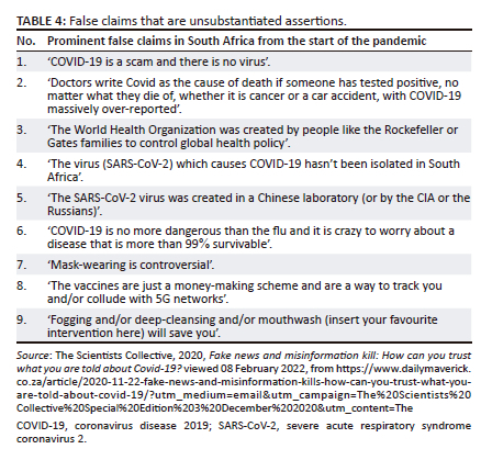 They debunk several false claims that made the rounds in South Africa from the start of the pandemic, showing the widespread and disruptive influence of false information on the South African government's attempts to address the pandemic and the impact on and complicity of the South African public. The South African government embarked on a wide-ranging information campaign and criminalised the dissemination of false information concerning the pandemic and the government's fight against it, showing that false information was prevalent in South Africa in the first year of the pandemic. The scourge of false information can arguably be blamed on distrust in government and cynicism towards the efforts of international health authorities, but the finding is that false information was very prevalent in South Africa during the first year of the COVID-19 pandemic.