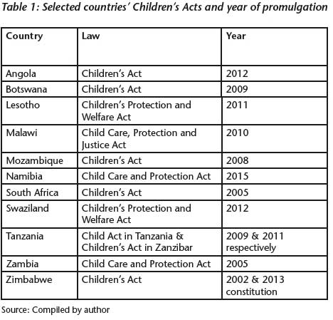 In the last 30 years, one of the staggering successes in the child rights sector is recognition of both the Convention on the Rights of the Child (CRC) and the African Children's Charter as key human rights instruments. For both instruments, there is near universal ratification on the continent. As far as the African Children's Charter is concerned, at the time of the writing of this article only five countries had not ratified it. After universal ratification, the discussions of stakeholders and member states alike should move from ratification.25 The next frontier is ensuring that member states domesticate the provisions of these instruments into their national laws. Already, some of the countries have developed Children's Acts that are anchored on the African Children's Charter. Table 1 shows that several countries in Southern Africa came up with wholesale Children's Acts after the African Children's Charter came into effect. Although some of the laws still need to be reviewed on some of the provisions, it can be unequivocally said that the situation was not the same before the existence of the African Children's Charter.